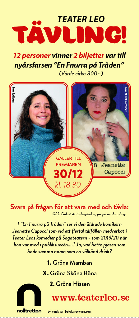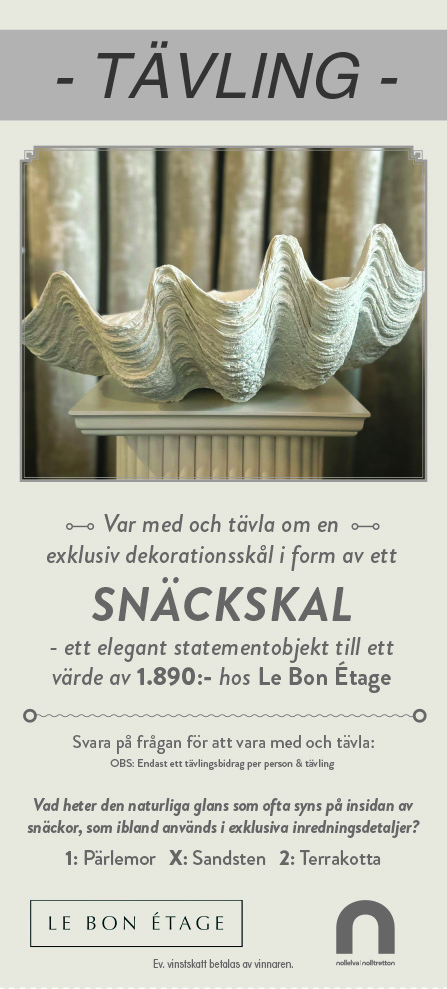 Tävla om två biljetter till nyårsfarsen "En Fnurra på Tråden" på Sagateatern den 30/12 (vi har biljetter till 12 vinnare) (ev. vinstskatt betalas av vinnaren). Svara på frågan för att delta i tävlingen. Maila in svaret till benny@nolltretton.se senast den 5/12-2025. Märk ämnesraden med "En Fnurra på Tråden". Tävla om en dekorationsskål från "Le Bon Étage" (värde 1.890:-). (ev. vinstskatt betalas av vinnaren). Svara på frågan för att delta i tävlingen. Maila in svaret till benny@nolltretton.se senast den 5/12-2025. Märk ämnesraden med "Le Bon Étage".